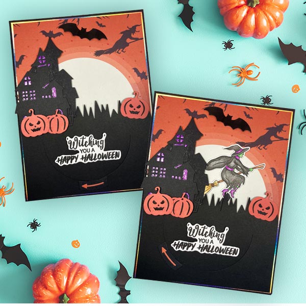 This die set features iconic Halloween themed designs that include pumpkins, gravestones, coffins, haunted houses, bats, a witch and a 'Boo!' speech bubble. Why not use the witch with the Made To Surprise Turn & Reveal interactive die mechanism and watch her fly across the moonlit sky!